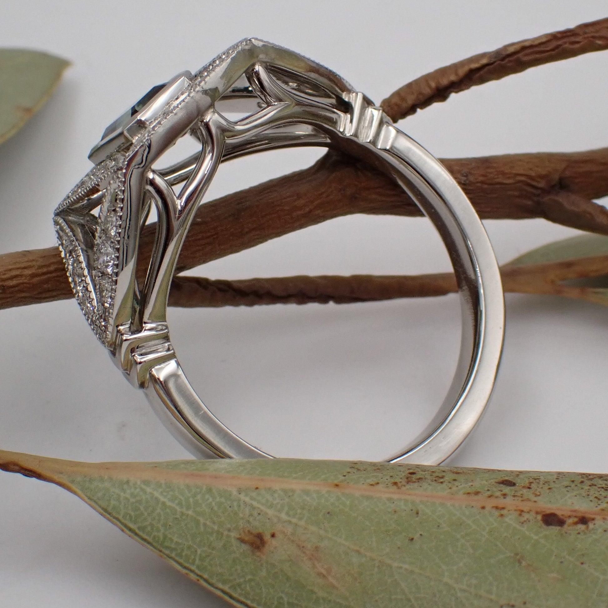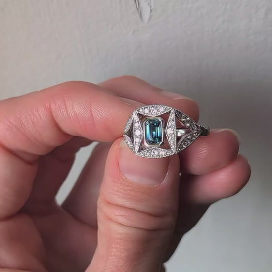 CENTRE STONE: Australian Parti Sapphire - predominantly teal. Emerald cut, 0.75ct.